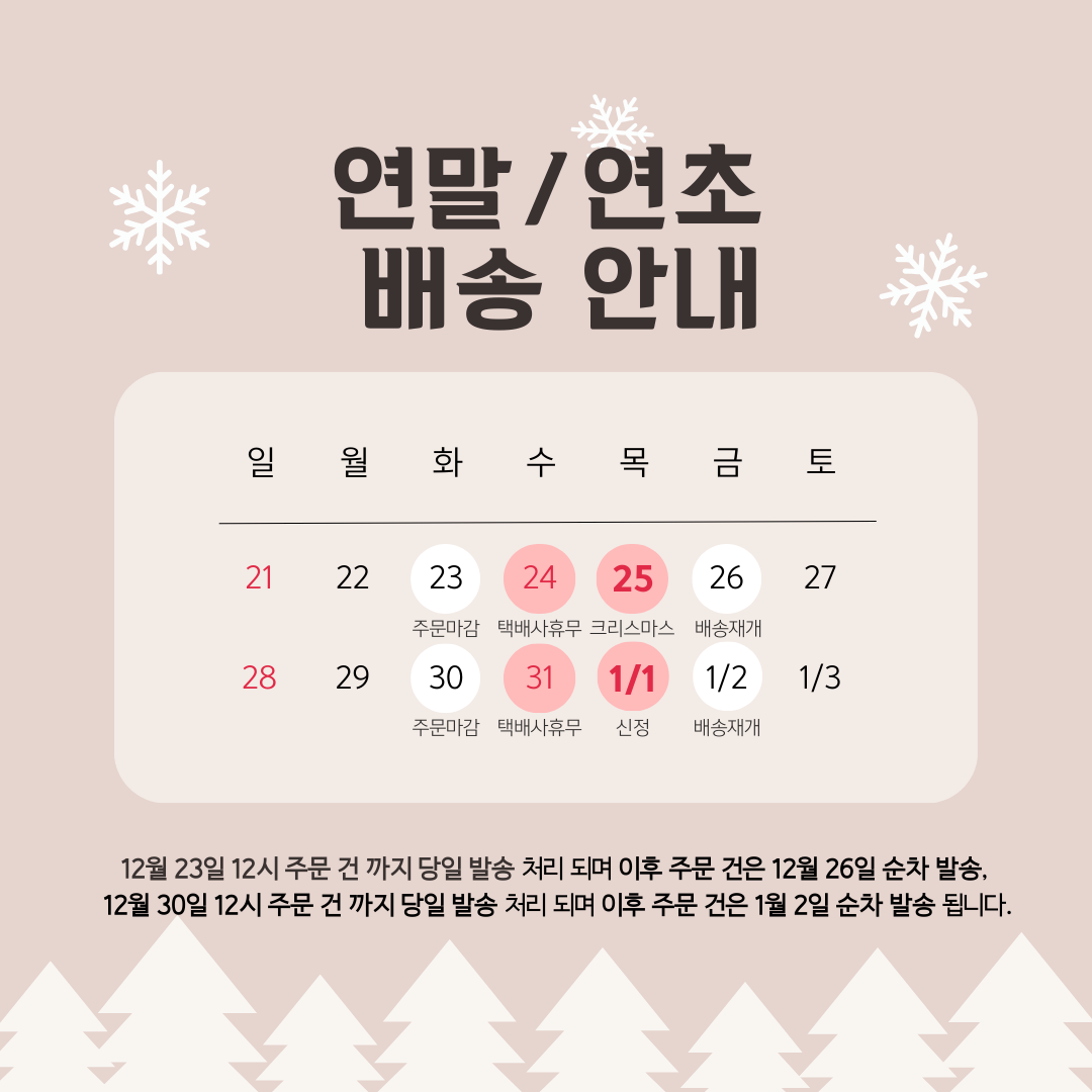 ※12월 23일(화) 오후 12시 주문 건 까지 당일 발송 처리 되며 이후 주문건은 12월 26일(금) 부터 순차 배송 됩니다.※